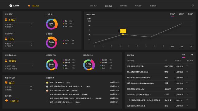 實時掌握用戶動態,描繪用戶畫像園區注冊用戶、活躍用戶、帖子數、活動參與情況等